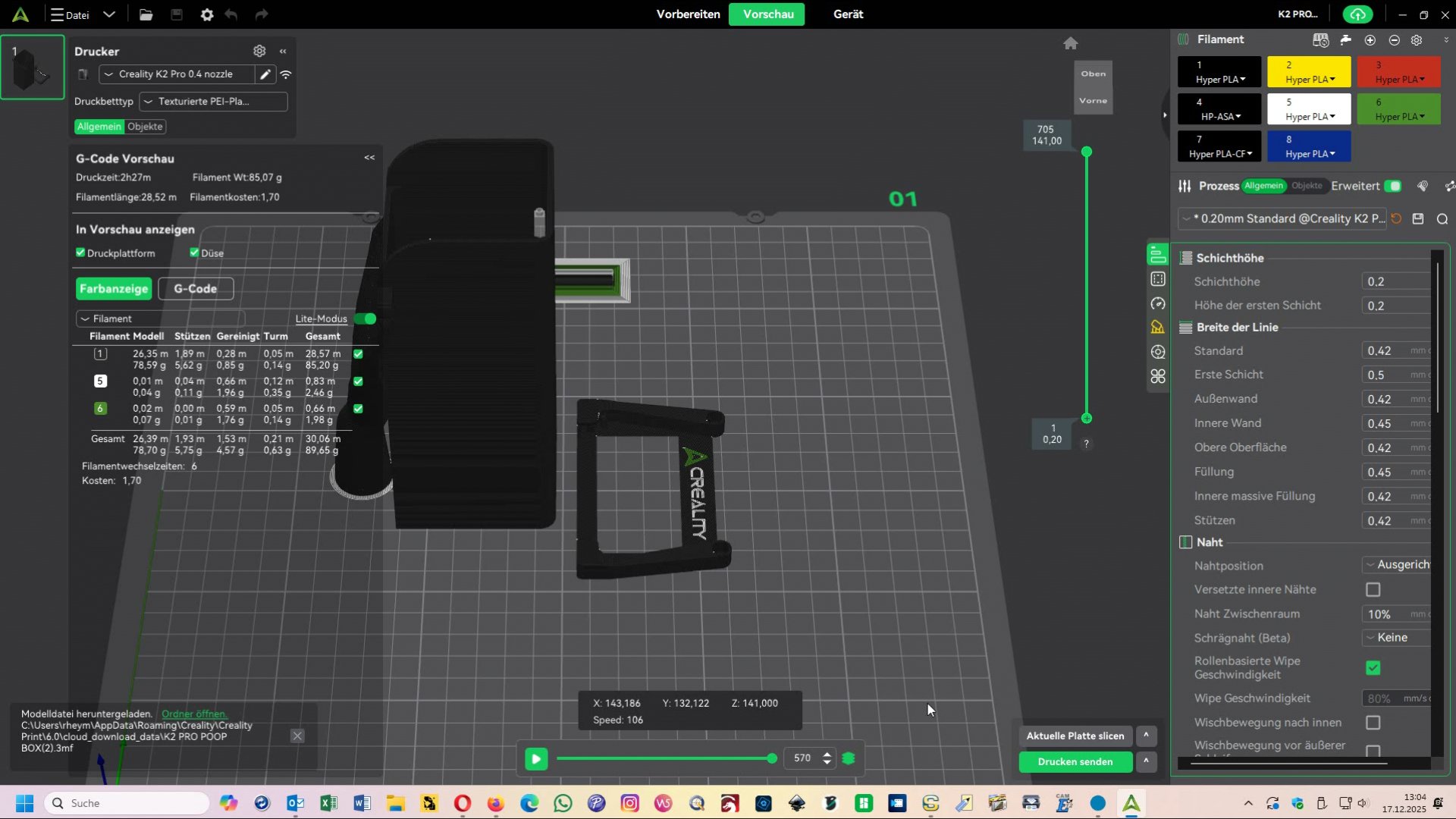 Schon nach dem Auspacken wirkt der Drucker wertig und solide gebaut: Der Rahmen ist stabil, das Gerät wirkt hochwertig — keine wackelige Bastelbude, sondern eine "echte Maschine". Die Einrichtung ging überraschend schnell: Dank Smart Auto Leveling und intuitiver Software war der erste Druck — sogar mit Multicolor-Filamenten — nach relativ kurzer Zeit gestartet. Die Druckqualität ist beeindruckend — selbst bei höheren Geschwindigkeiten sind Details sauber, Schichten gleichmäßig, Oberflächen glatt. Besonders bei Materialien, die höhere Temperaturen oder stabile Umgebung erfordern (z. B. ABS, ASA, CF-Filamente) zeigt sich die Stärke des K2 Pro Combo durch stabile Ergebnisse ohne Warping oder Haftprobleme. Das Multicolor-System mit CFS ist ein großer Pluspunkt: Für kreative Projekte (mehrfarbige Modelle, komplexe Designs) oder funktionale Teile mit mehreren Materialien/Mischungen bietet es deutlich mehr Flexibilität als ein einfacher Single-Filament-Drucker.